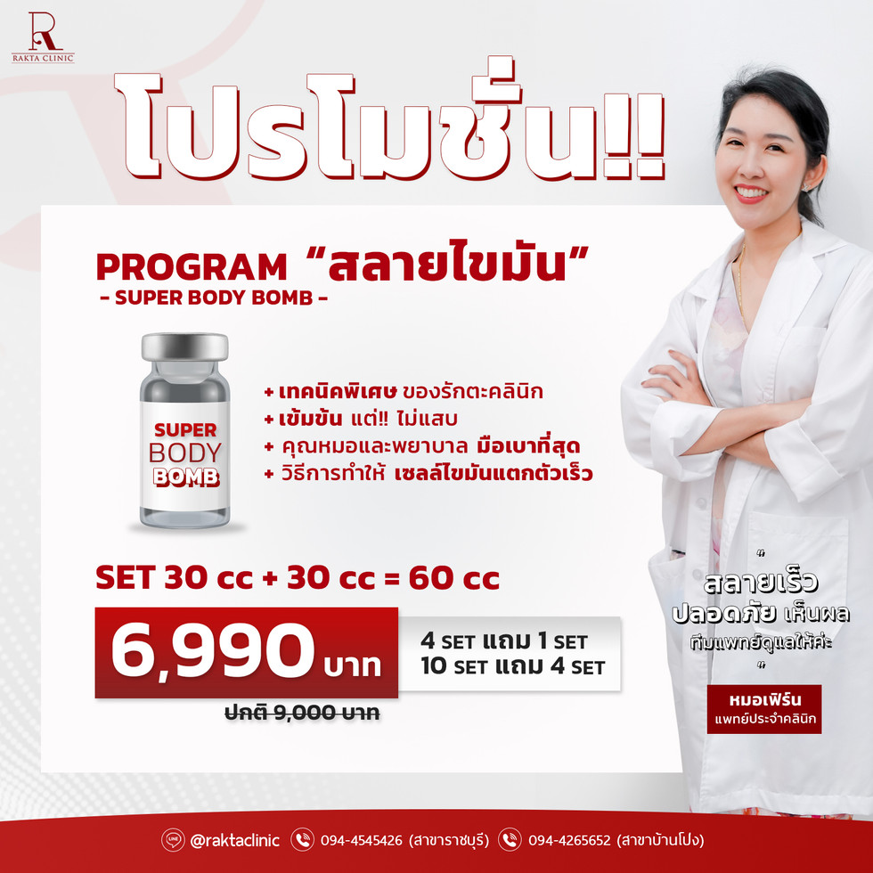 PROGRAM "สลายไขมัน" SUPER BODY BOMB เหมาะกับ เหนียงใต้คาง แก้ม แขน ขา หน้าท้อง ไขมันสะสมใต้ก้นแน่นๆ ด้วยเทคนิคพิเศษของรักตะคลินิก . โปรโมชั่น โปรแกรม "สลายไขมัน" ━━━━━━━━━━━ SET 30 cc + 30 cc = 60 cc เพียง 6,990 บาท (ปกติ 9,000 บาท) ━━━━━━━━━━━ 4 SET แถม 1 SET 10 SET แถม 4 SET . โปรพิเศษสำหรับโพสนี้ นัดคิวด่วนๆ หมดแล้วหมดเลย . ทักเลย m.me/raktaclinic แอดมินพร้อมรับจองค่าา . จองไว้ก่อน เก็บไว้ได้ คอร์สไม่หมดอายุ แบ่งกับเพื่อนก็ได้ แอดไลน์ @raktaclinic สอบถามเพิ่มเติม "ปรึกษาฟรี" กับทีมเเพทย์รักตะคลินิก หรือดูรีวิวเพิ่มเติม คลิก https://lin.ee/8DjhkFP . รักตะคลินิก จริงใจ ปลอดภัย เห็นผล ปรึกษาฟรี ทีมแพทย์รักตะคลินิกพร้อมให้บริการ . เปิดให้บริการทุกวัน 10.00 - 20.00 น. >>สอบถาม-จองคิว<< ━━━━━━━━━━━ (สาขาราชบุรี ซ.เสือป่า5 ใกล้กรมที่ดิน) Tel: 094-4545426 พร้อมให้บริการ แผนที่ https://goo.gl/maps/mTJdzEmQeDMdN9Su8